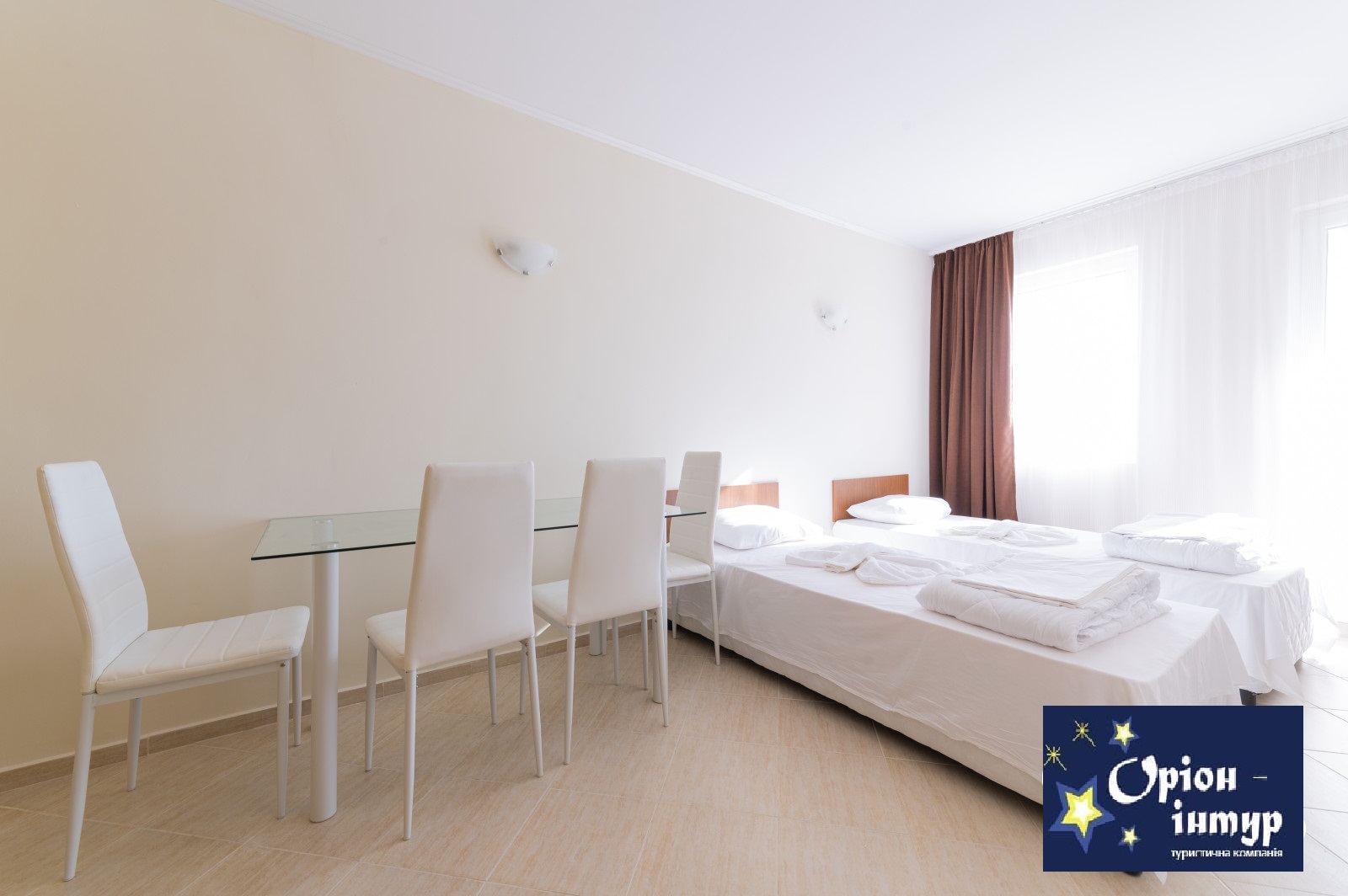 Номер "студия" (количество номеров ограничено) площадью от 30 до 40 м2 имеют 2 или 3 основные кровати, кондиционер, тумбочки, стол со стульями, телевизор, платяной шкаф, санузел с душем и туалетом, балкон с летней мебелью и сушкой;