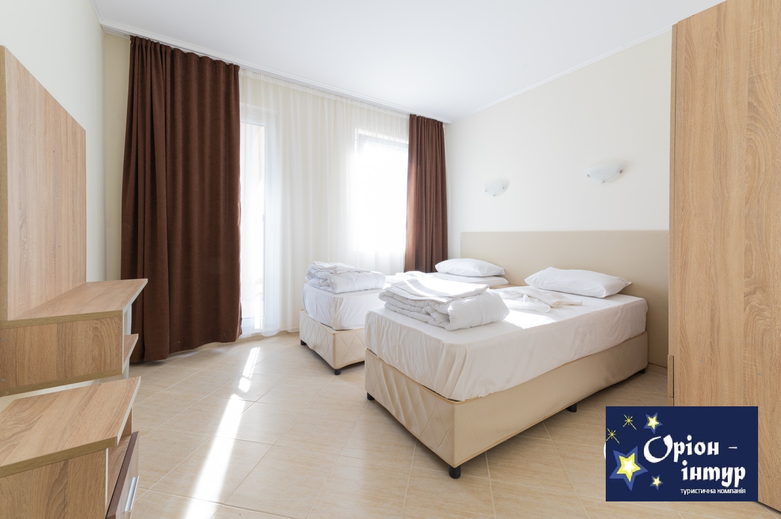 Апартаменты из двух комнат: апартаменты площадью от 50 до 65 м2 состоят из двух комнат, кондиционер, тумбочки, стол со стульями, телевизор, платяной шкаф, один санузел с душем и туалетом, балкон с летней мебелью и сушкой. В каждой из комнат 2 или 3 основные кровати (2+2; 2+3);