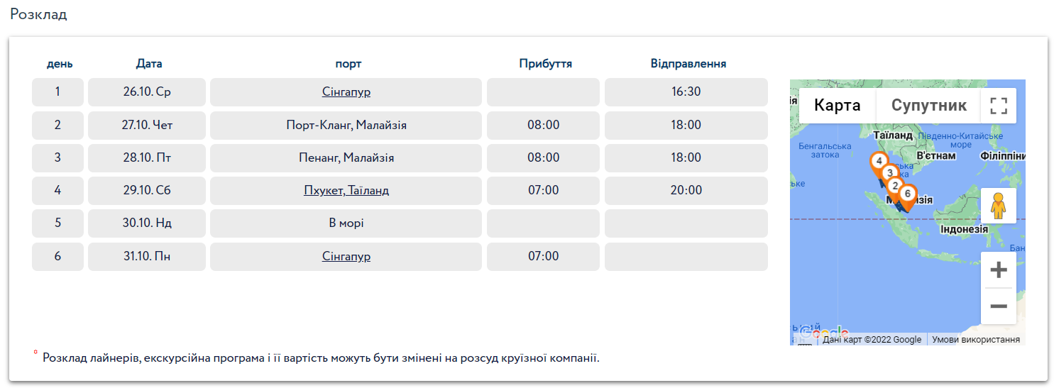 Сінгапур | Порт-Кланг, Малайзія | Пенанг, Малайзія | Пхукет, Таїланд | В морі | Сінгапур