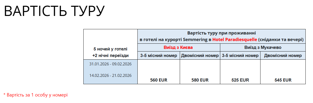 Или выезд из Киева на автобусе. 09:30 – встреча группы – г. Киев, автостанция Дачная. 10:00 - Организованный выезд автобусом из Киева. Выезд на границу. Прохождение украинско-венгерской/словацкой границы. Ночной переезд на курорт Земмеринг в Австрии. |